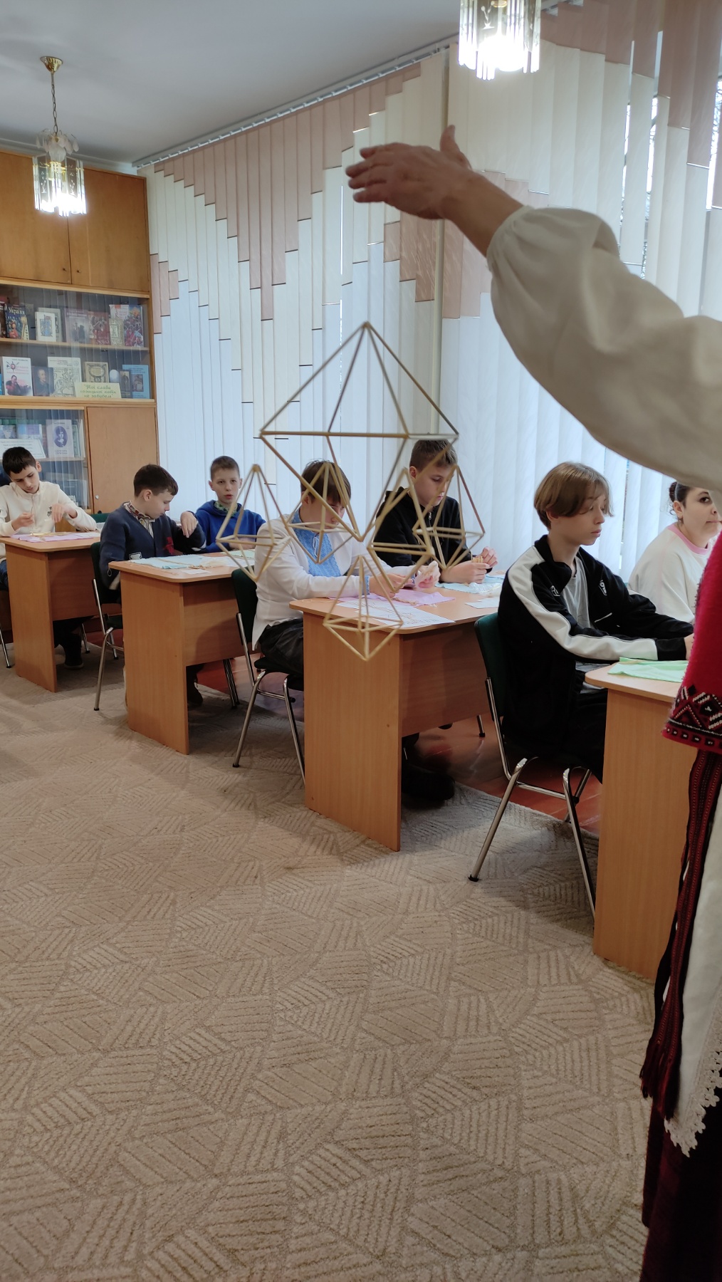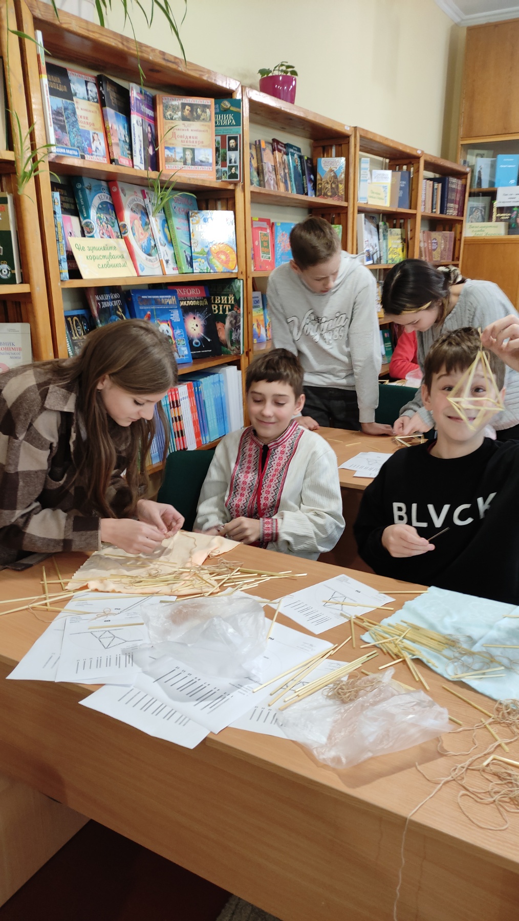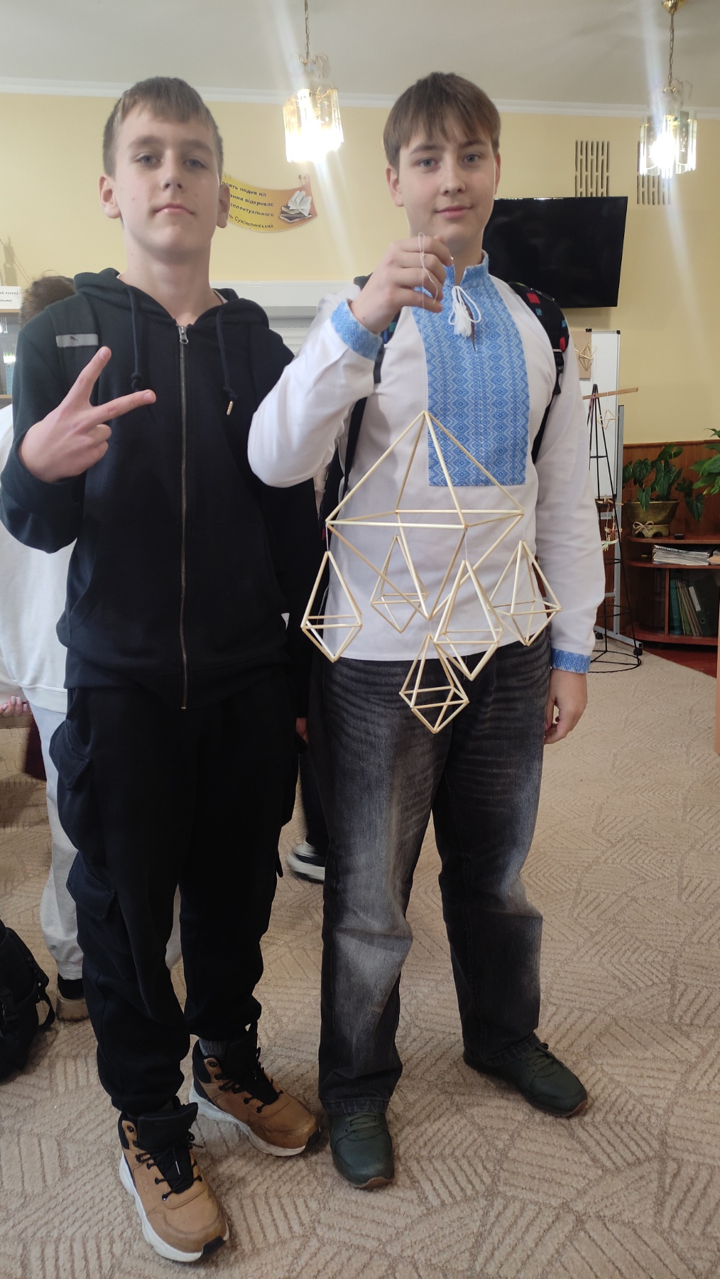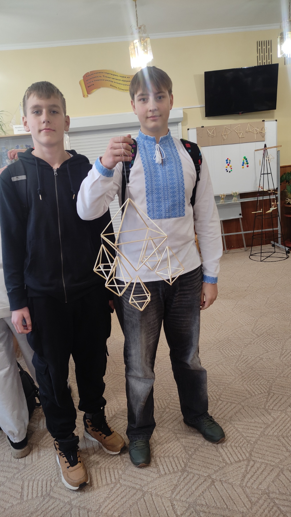 На практичній частині восьмикласники отримали все необхідне: підготовлену солому, міцні нитки, а головне – чіткі схеми для складання об'ємної фігури. Діти вчилися мистецтву з'єднання тонких соломинок у складні пірамідальні модулі, які згодом збираються в єдину, рухливу конструкцію. Це заняття вимагало неабиякої уваги, терпіння та математичної точності! Хоча учні продемонстрували високий рівень зацікавленості та наполегливості, через складність техніки й обмежений час повністю завершити свої роботи не вдалося. Проте пані Якимович подбала й про це! Кожен учасник отримав набори матеріалів, інструкції та схеми, щоб продовжити роботу вдома. Це чудовий привід для ліцеїстів не лише освоїти ремесло, а й залучити до творчості батьків чи молодших членів родини, створивши свій власний, зроблений з любов'ю різдвяний оберіг.