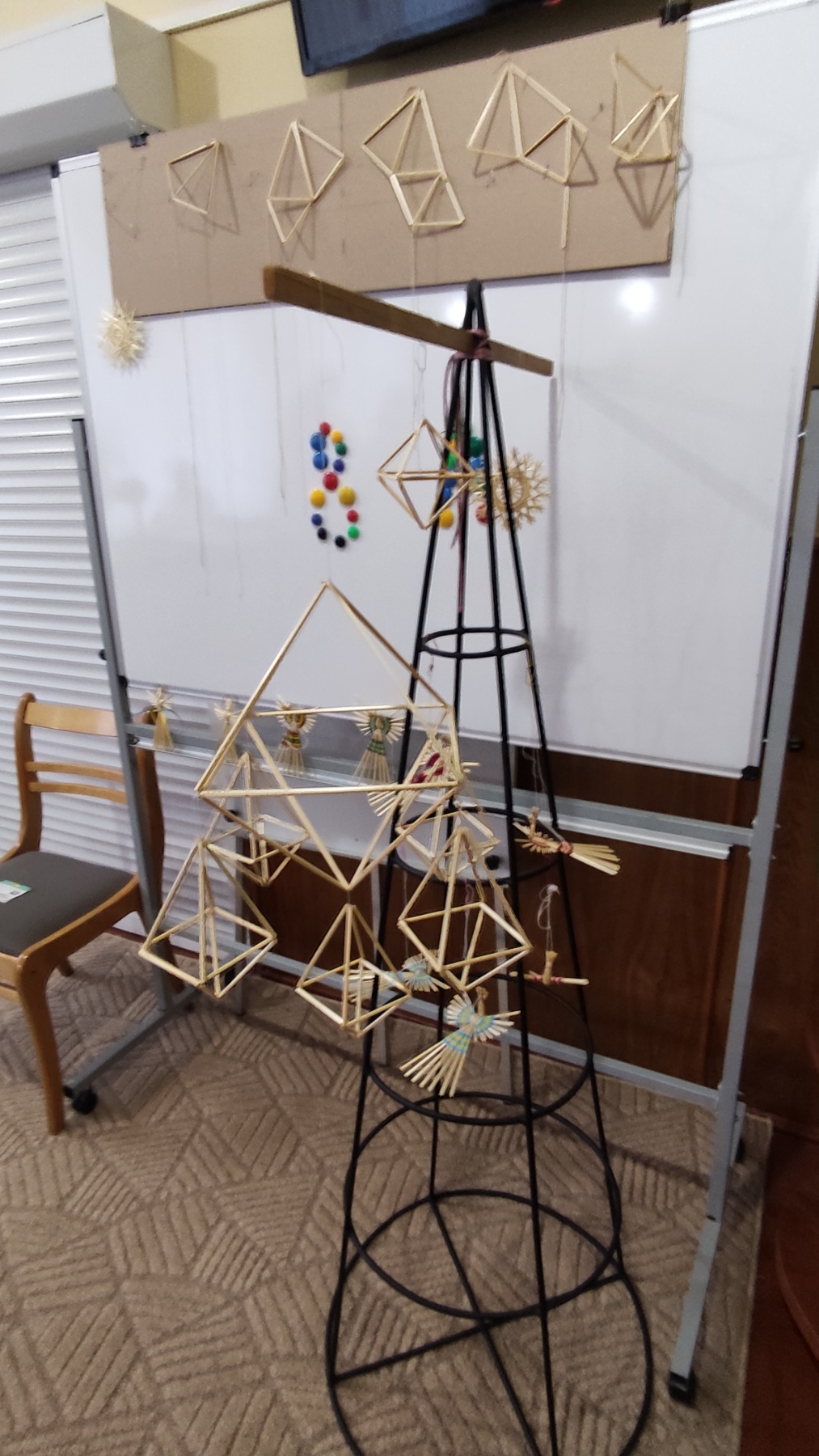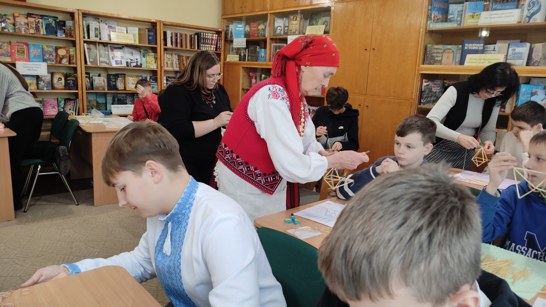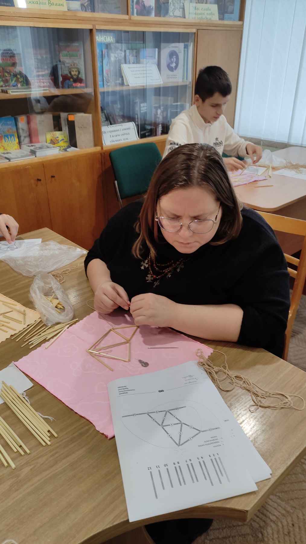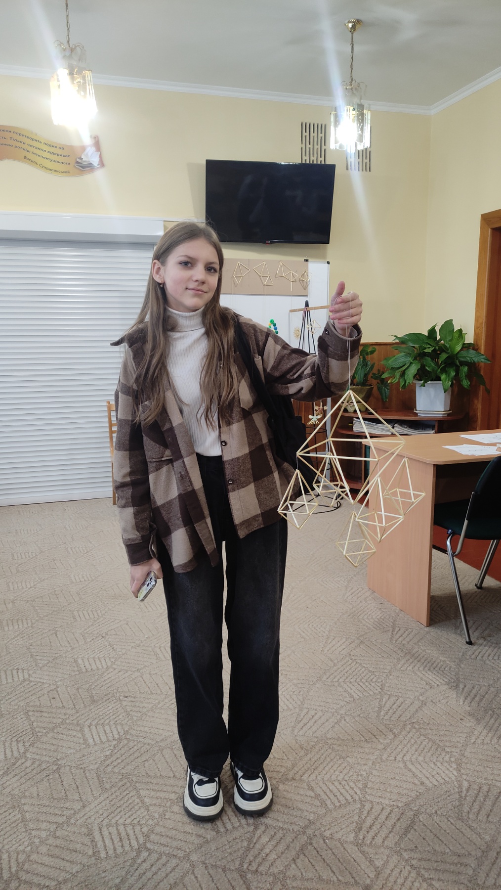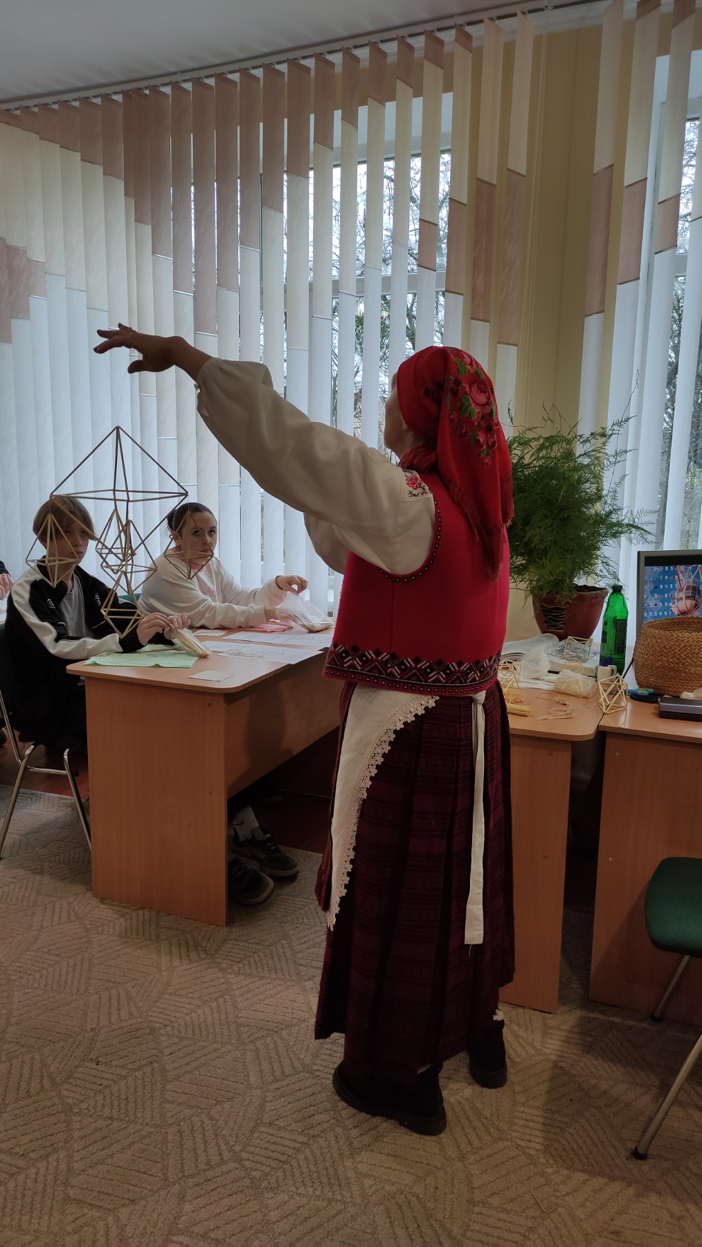 На практичній частині восьмикласники отримали все необхідне: підготовлену солому, міцні нитки, а головне – чіткі схеми для складання об'ємної фігури. Діти вчилися мистецтву з'єднання тонких соломинок у складні пірамідальні модулі, які згодом збираються в єдину, рухливу конструкцію. Це заняття вимагало неабиякої уваги, терпіння та математичної точності! Хоча учні продемонстрували високий рівень зацікавленості та наполегливості, через складність техніки й обмежений час повністю завершити свої роботи не вдалося. Проте пані Якимович подбала й про це! Кожен учасник отримав набори матеріалів, інструкції та схеми, щоб продовжити роботу вдома. Це чудовий привід для ліцеїстів не лише освоїти ремесло, а й залучити до творчості батьків чи молодших членів родини, створивши свій власний, зроблений з любов'ю різдвяний оберіг.