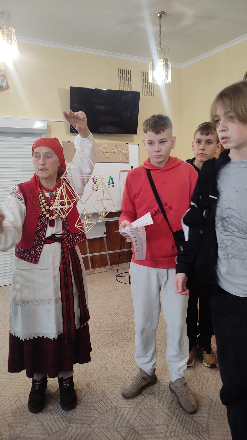 Майстер-клас розпочався із захопливої розповіді про глибокий сенс «Павука». Як пояснила Валентина Петрівна, ця геометрична конструкція не просто прикраса, а потужний символ Всесвіту, гармонії та достатку, який, за повір'ями, має захищати родину протягом року.