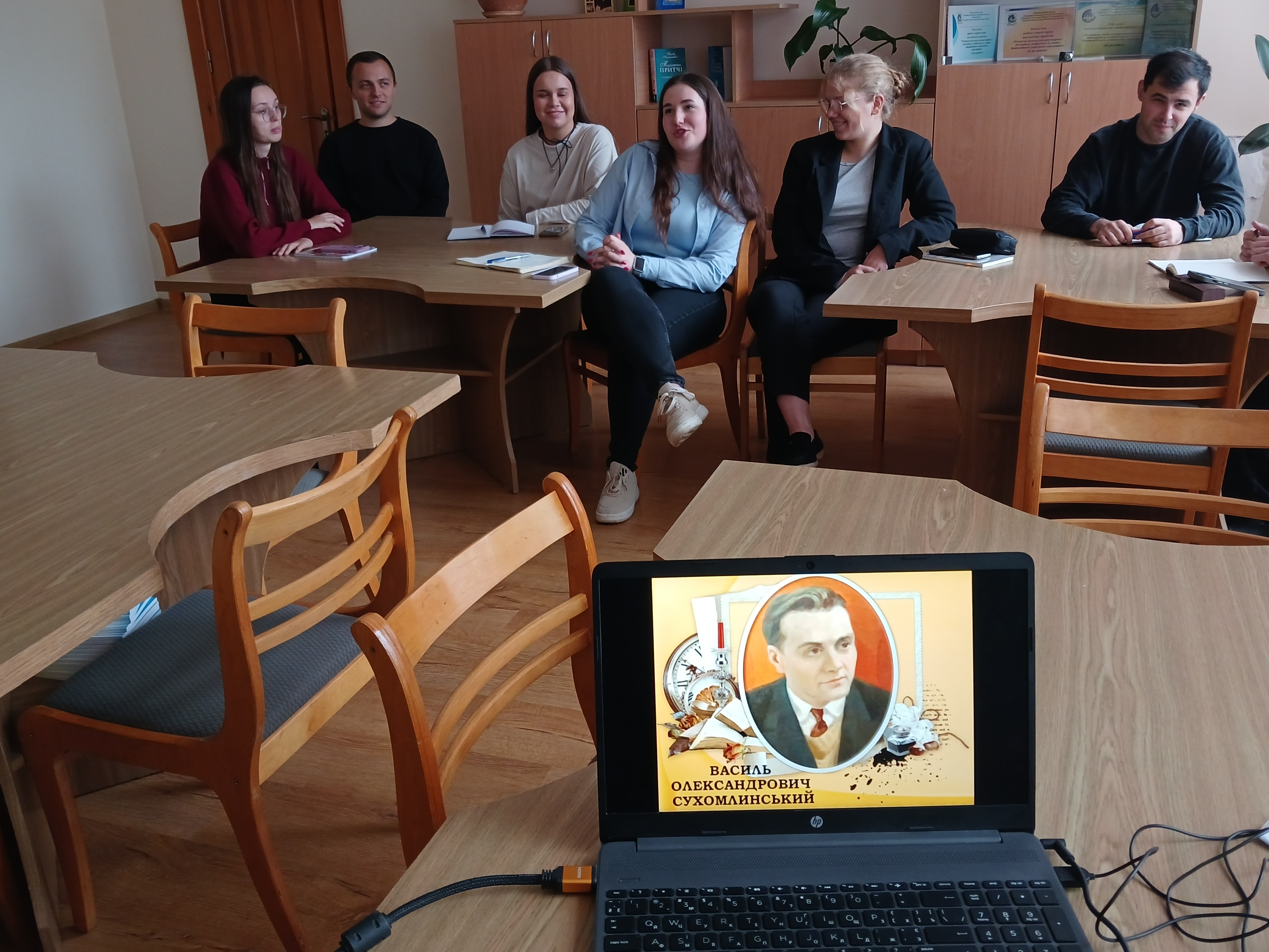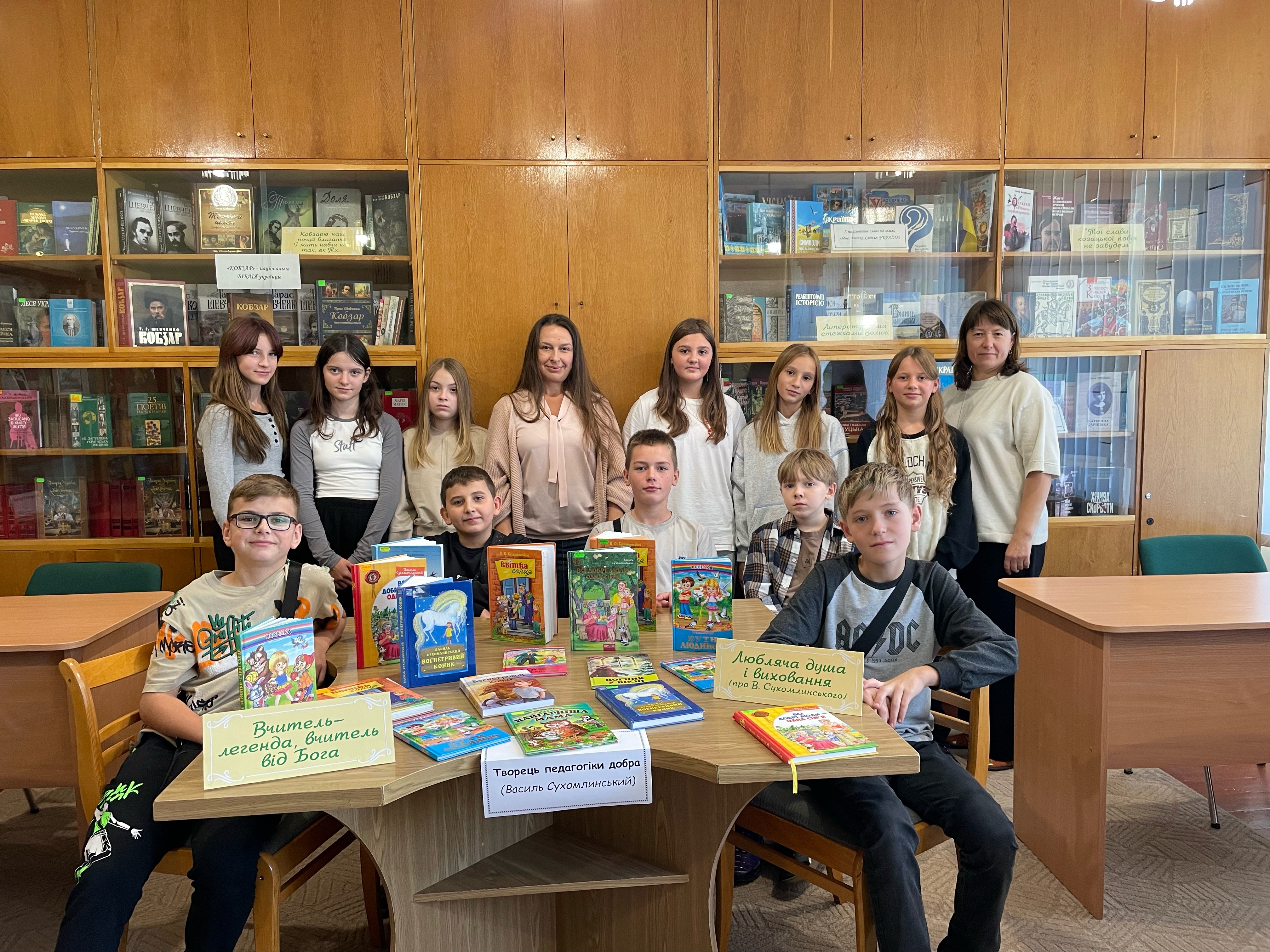 Бібліотекарі запросили ліцеїстів на літературну годину «Любляча душа і виховання», запропонували їхній увазі виставку творів В. Сухомлинського «Творець педагогіки добра» та презентацію дитячих малюнків за сюжетами його казок.