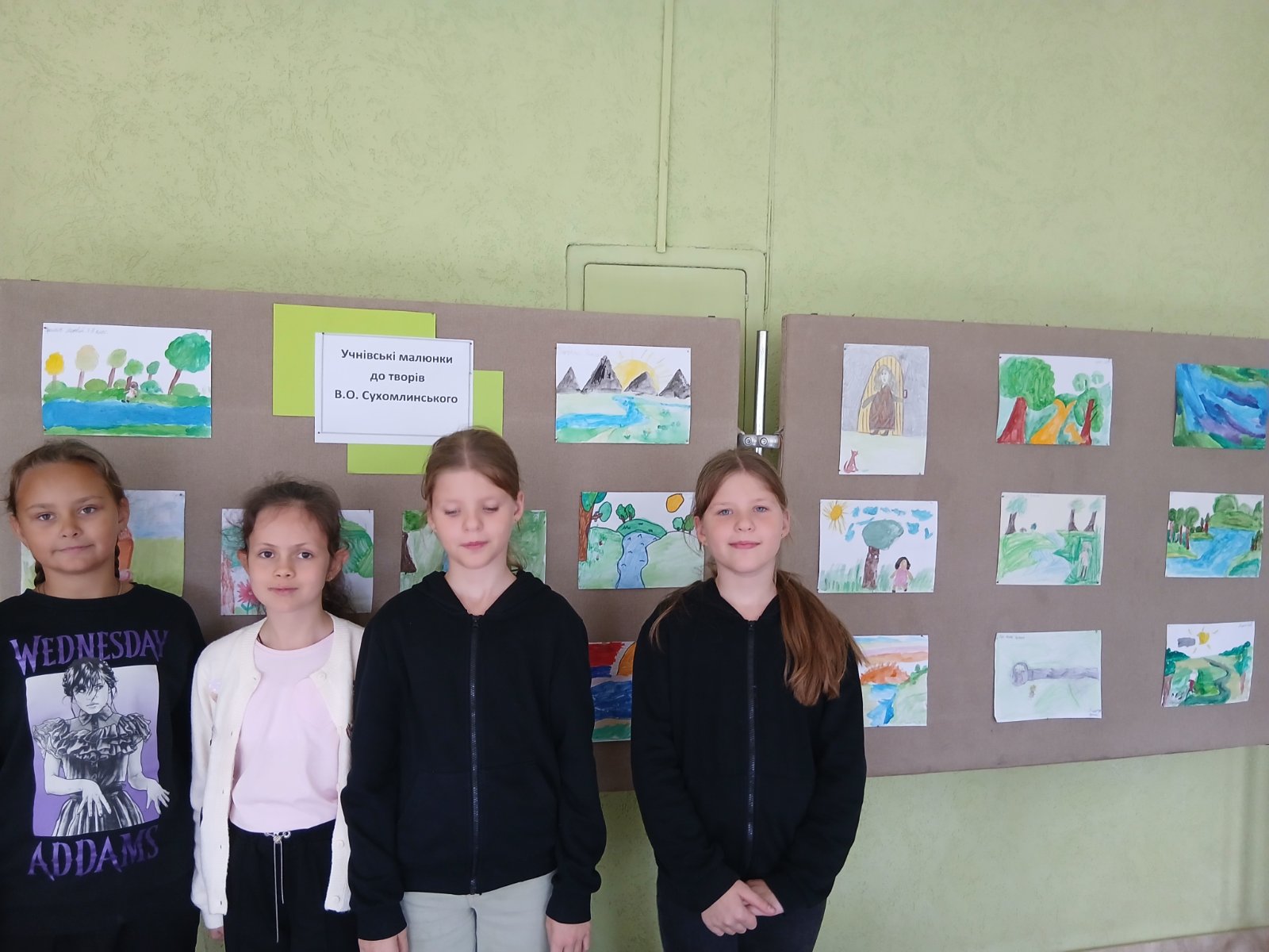 Учні побували на екскурсії в музейній кімнаті Василя Сухомлинського. Чудові творчі роботи ліцеїстів, родинні вишиванки-обереги, присвячені педагогу, були презентовані на виставках, організованих учителями образотворчого мистецтва й трудового навчання.