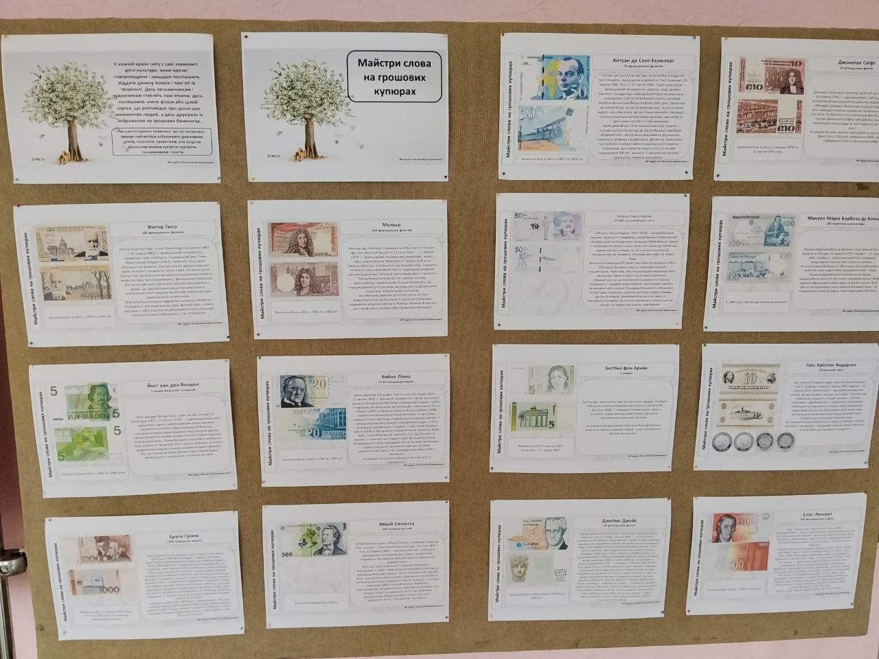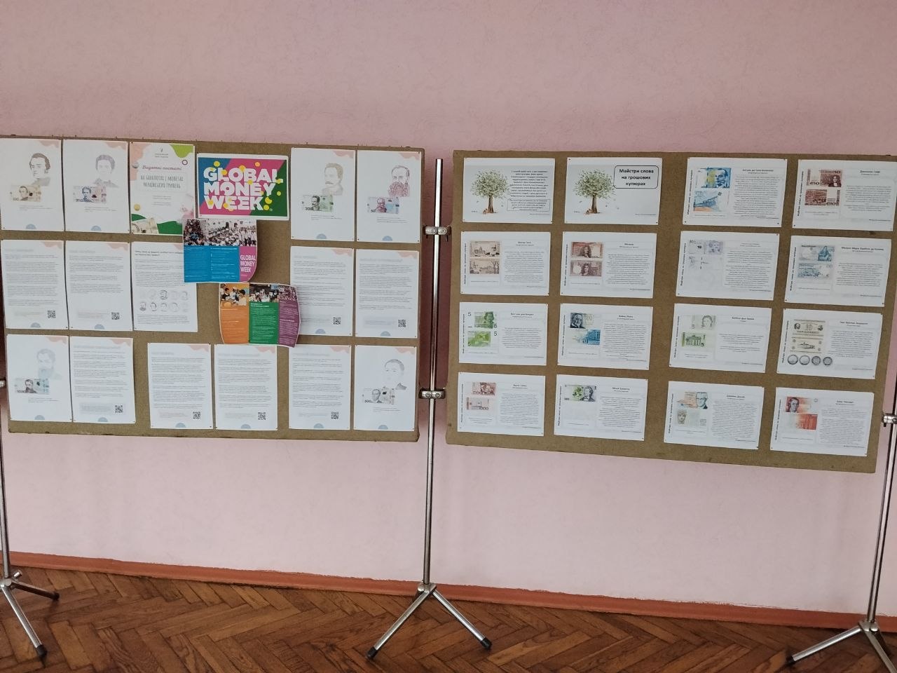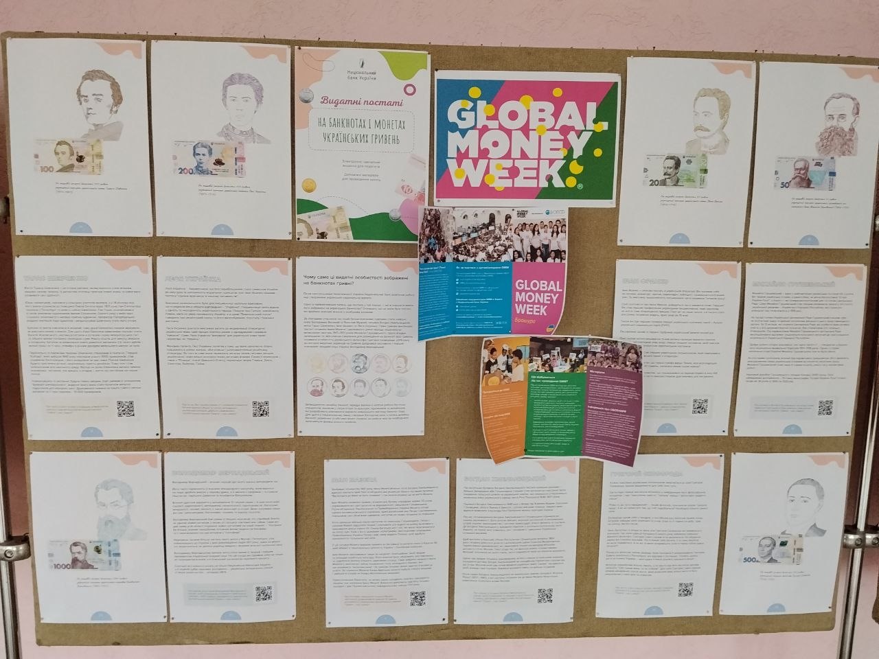 Здобувачі освіти протягом тижня в галереї ІІ поверху на постійно діючих стендах мали можливість ознайомитися з інформацією про Всесвітній тиждень грошей, дізнатися, як уберегтися від шахраїв, почерпнути цікаву інформацію про видатних українців, письменників різних країн, зображених на купюрах.