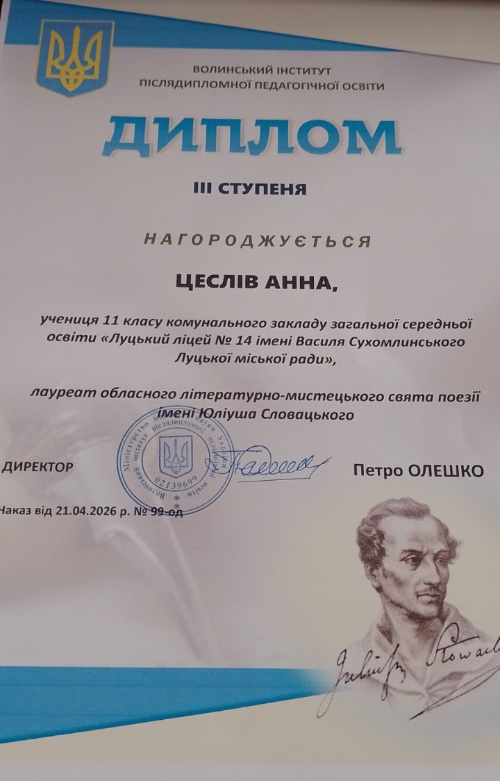 Честь нашого ліцею на обласному рівні гідно захищала учениця 11-А класу Анна Цеслів. Виступ ліцеїстки став яскравим підтвердженням її таланту й наполегливої праці. Бажаємо Анні подальших творчих успіхів та перемог!