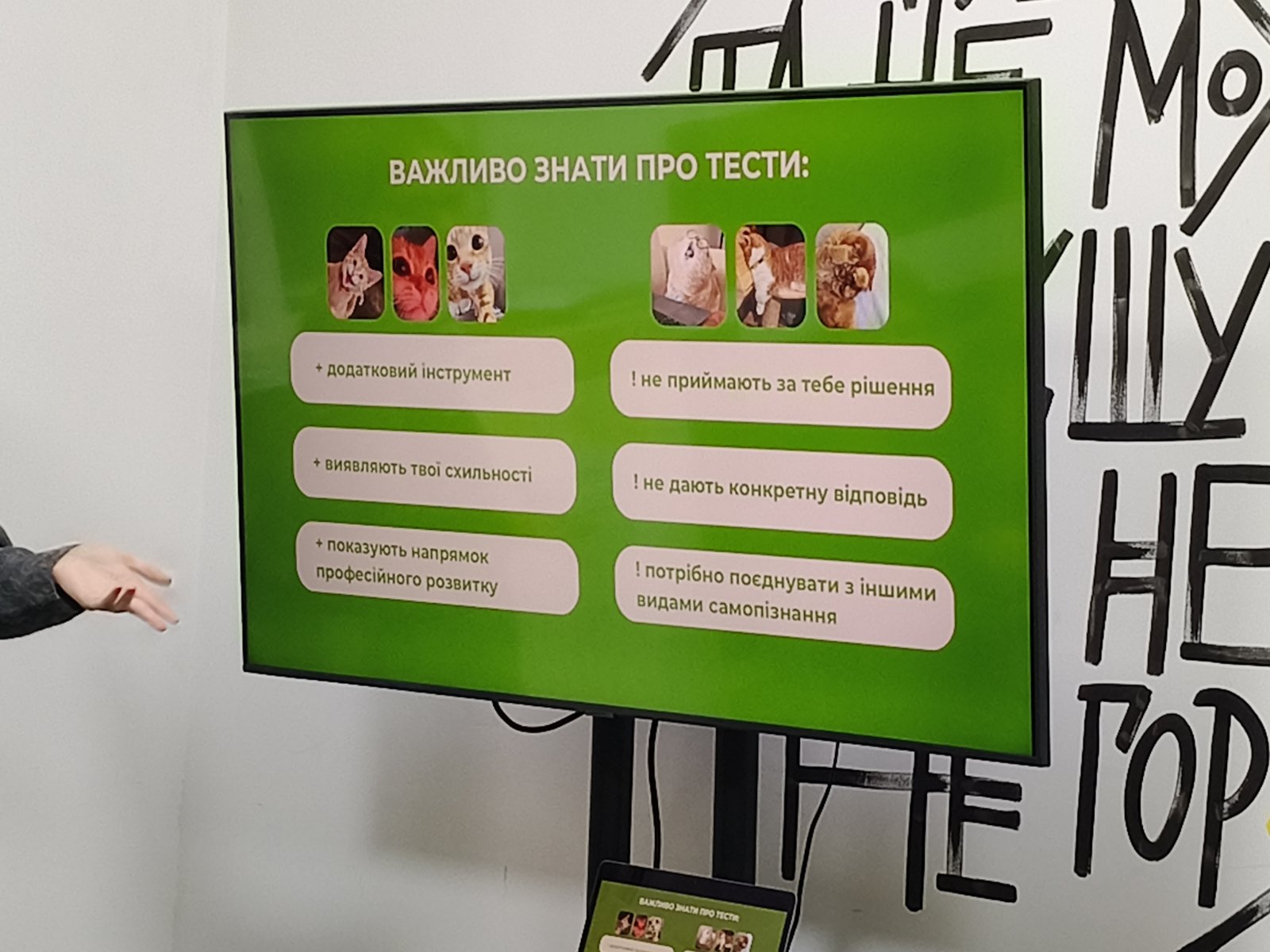 Розпочали зустріч з динамічної активності «Вітей дує на тих, хто…», де учасники ділилися професійними мріями та вподобаннями. Далі ліцеїсти проходили онлайн-тестування «Як більше дізнатись про себе», тренувалися в створенні алгоритму прийняття оптимального рішення на основі трьох важливих компонентів: інтереси, здібності та знайомилися з особливостями ринку праці.