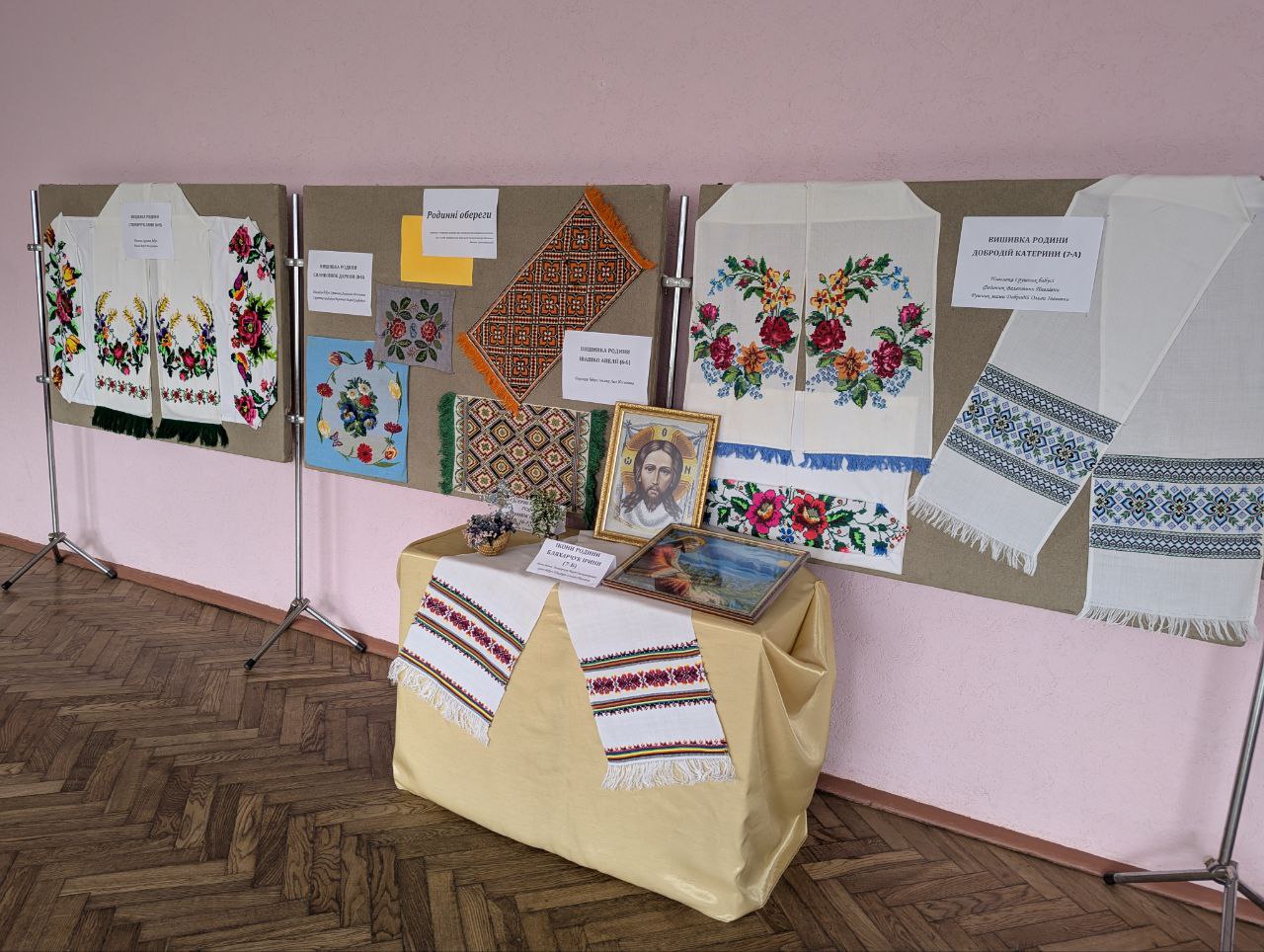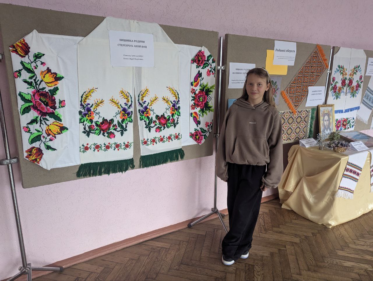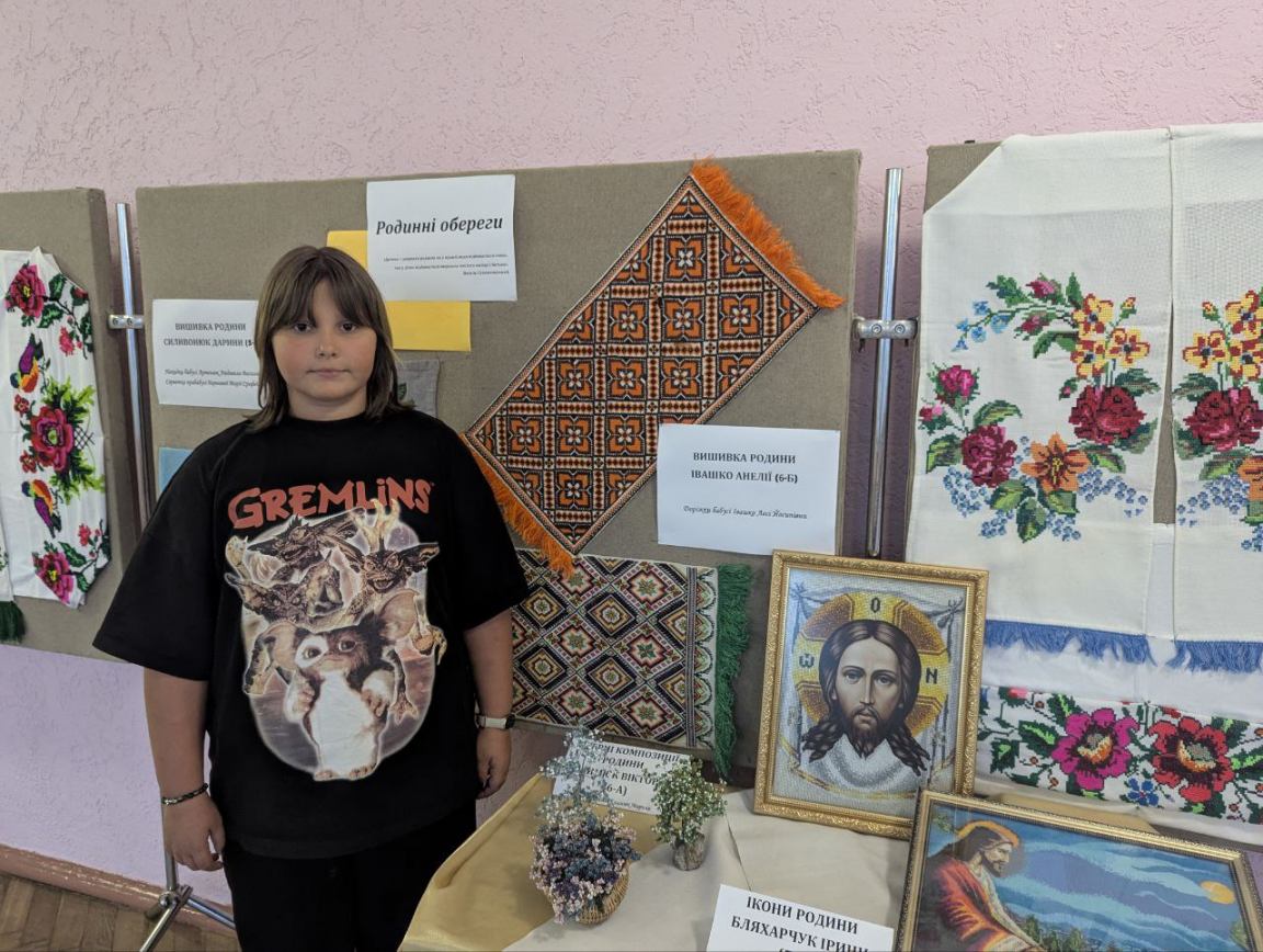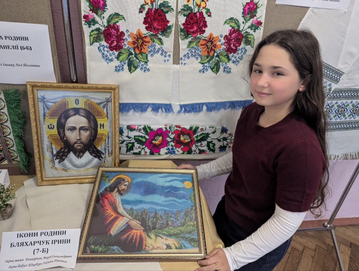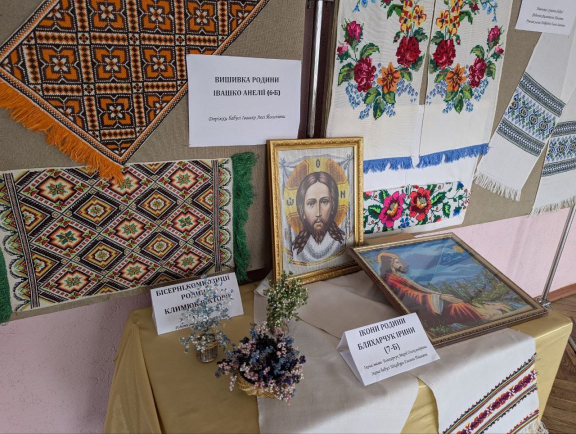 Климюк Вікторія (6-А) показала композиції з бісеру мами, а Бляхарчук Ірина (7-Б) - вишиті ікони мами та бабусі, що зберігаються в сім'ї.