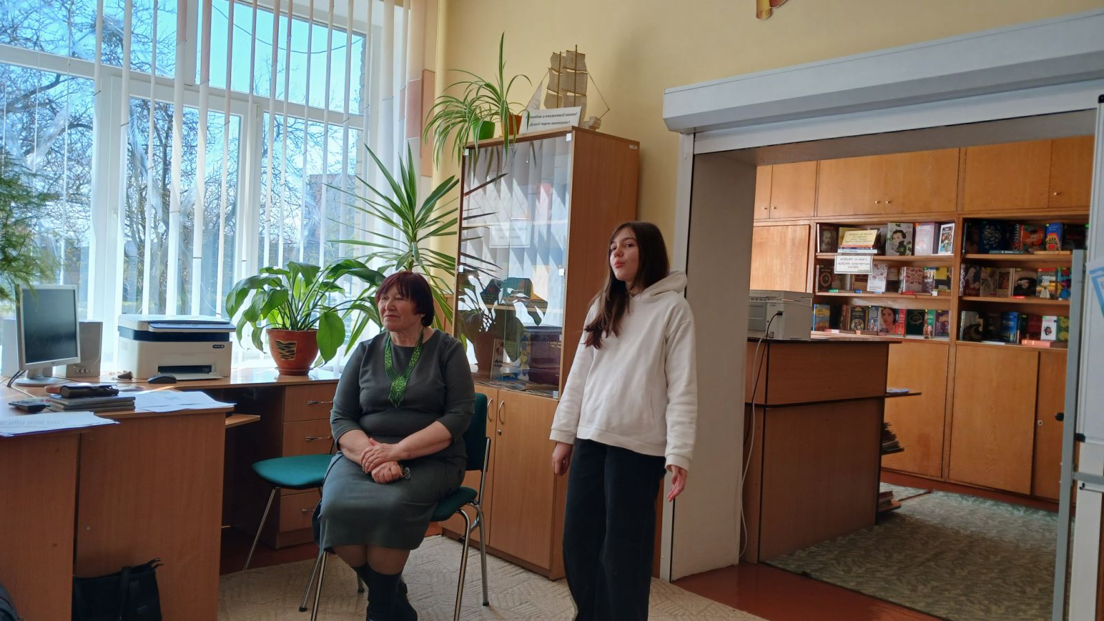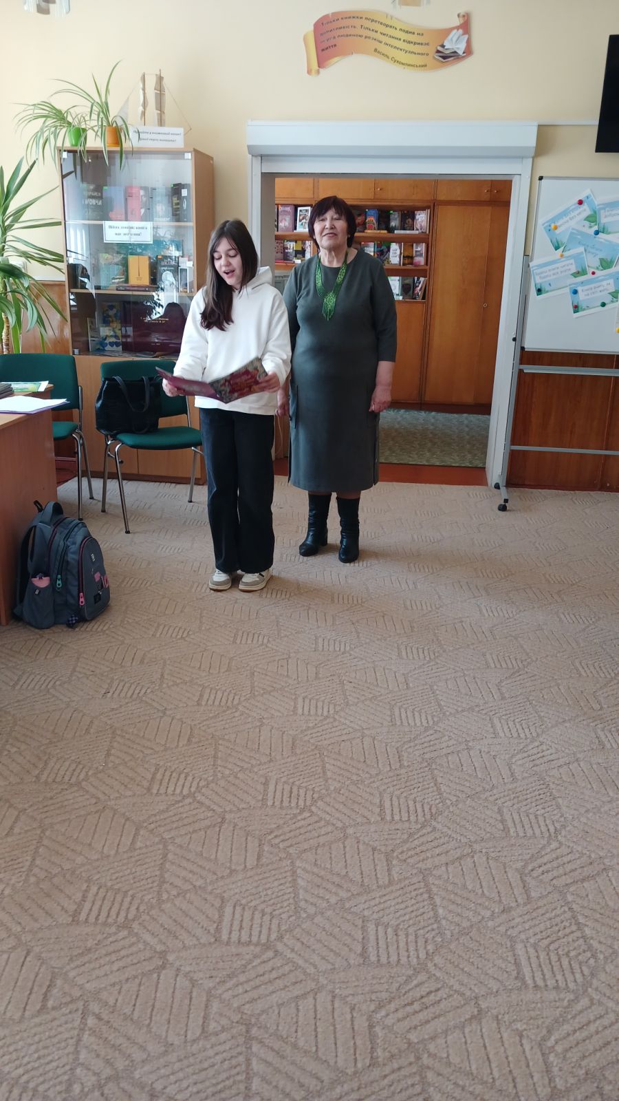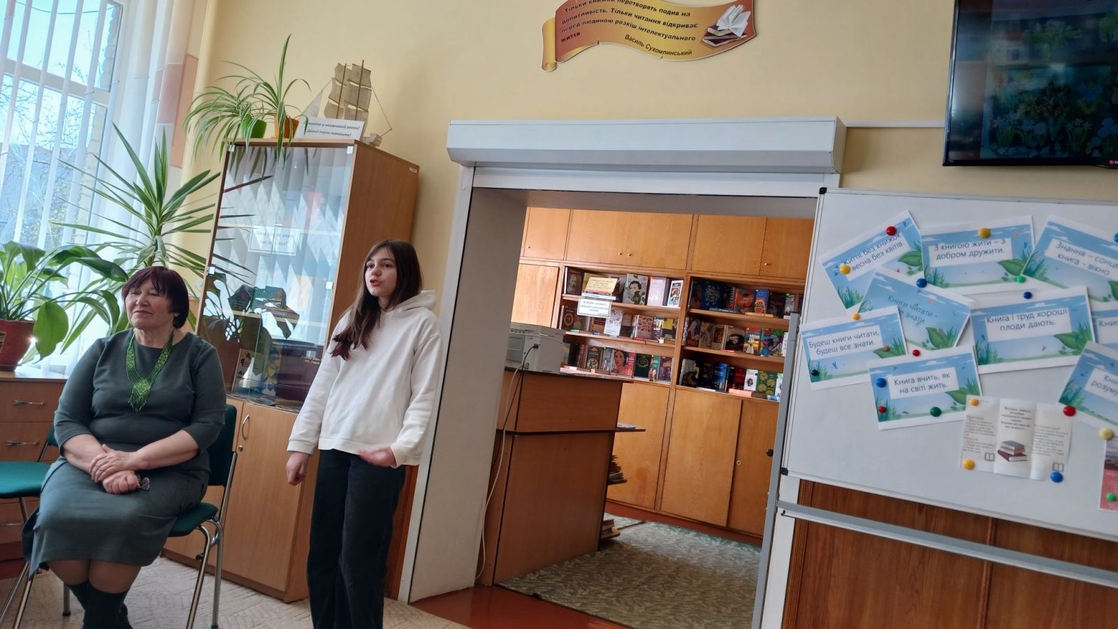 Аня прочитала вірш «Рідні слова», а Ніна Петрівна поспілкувалася з п'ятикласниками про основи віршування, про рими, про те, звідки бере художні образи для своїх віршів. Поетеса розповіла, що дуже любить писати твори для дітей, а особливо – веселі вірші. Діти разом пробували римувати: закінчували рядки, добирали власні рими. Поетеса зауважила, що досконалі рими – це римування іменника з дієсловом або ж із іншими частинами мови.