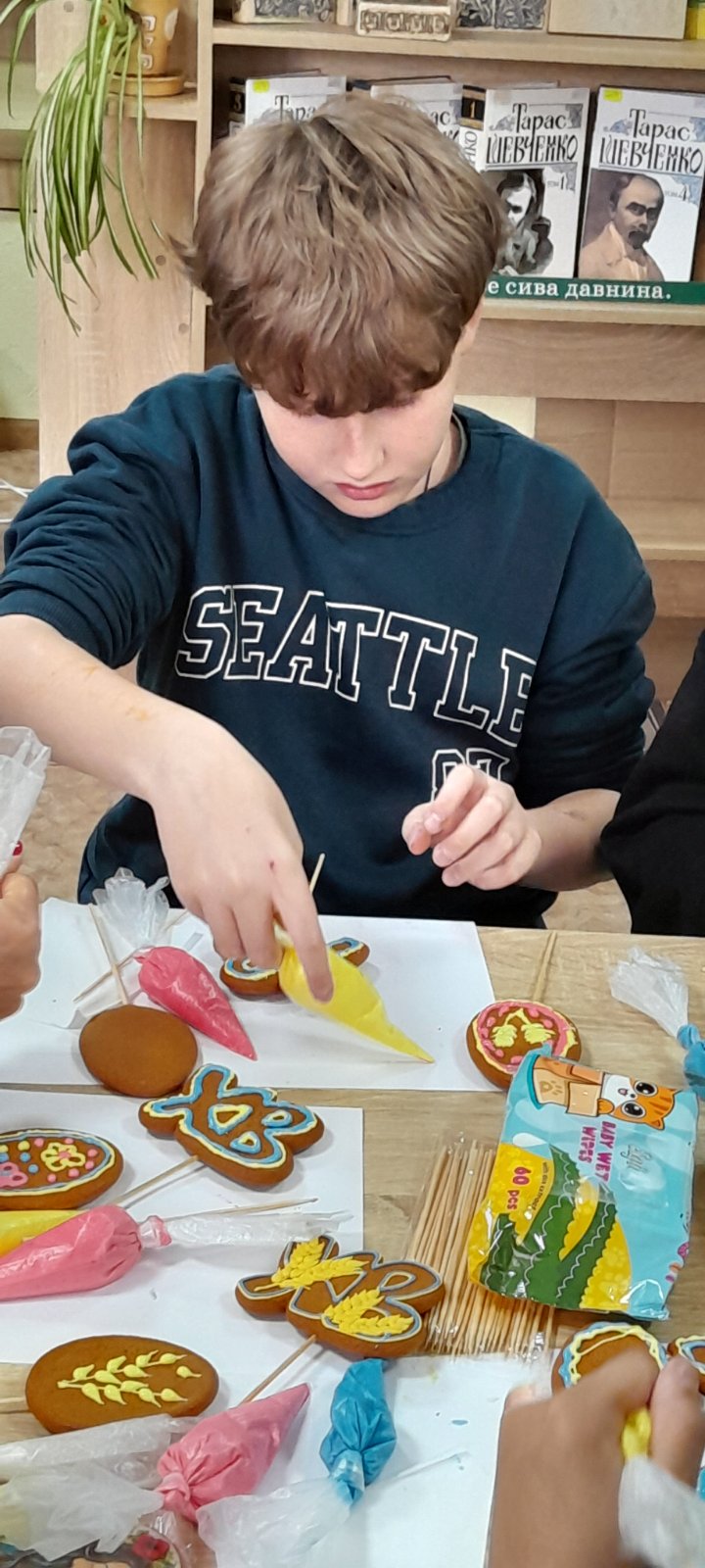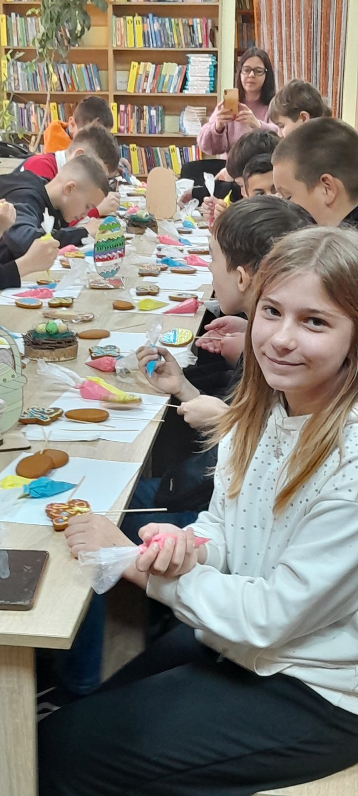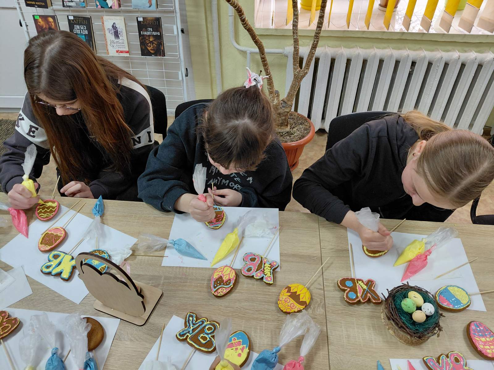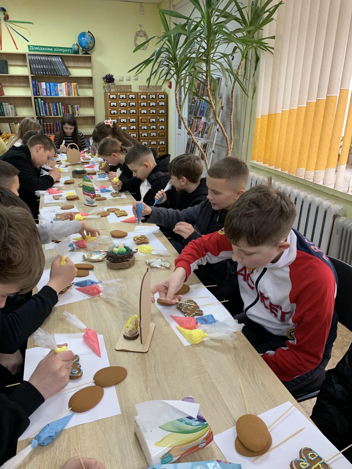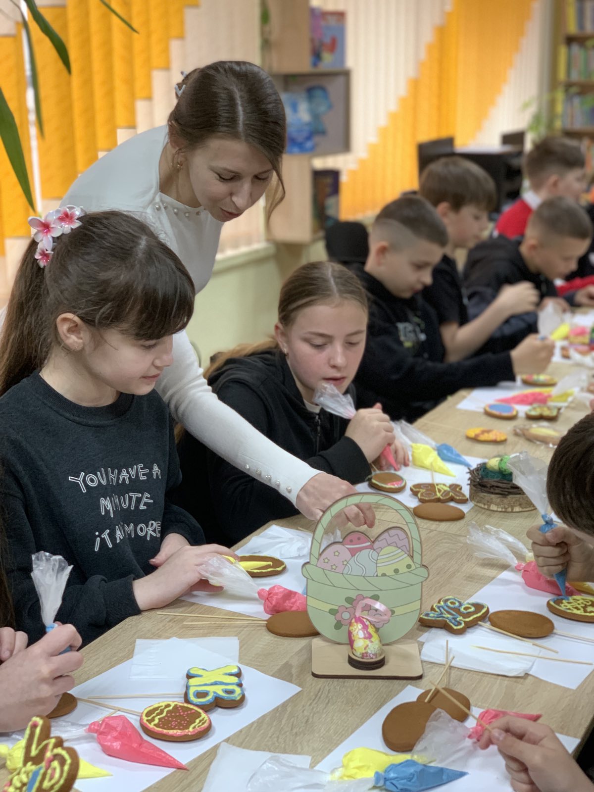 Напередодні світлого свята Великодня учні 6- Г класу взяли участь у майстер-класі з розпису імбирного печива. Захід відбувався в затишній атмосфері бібліотеки-філіалу №9.