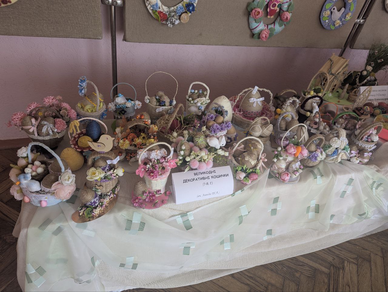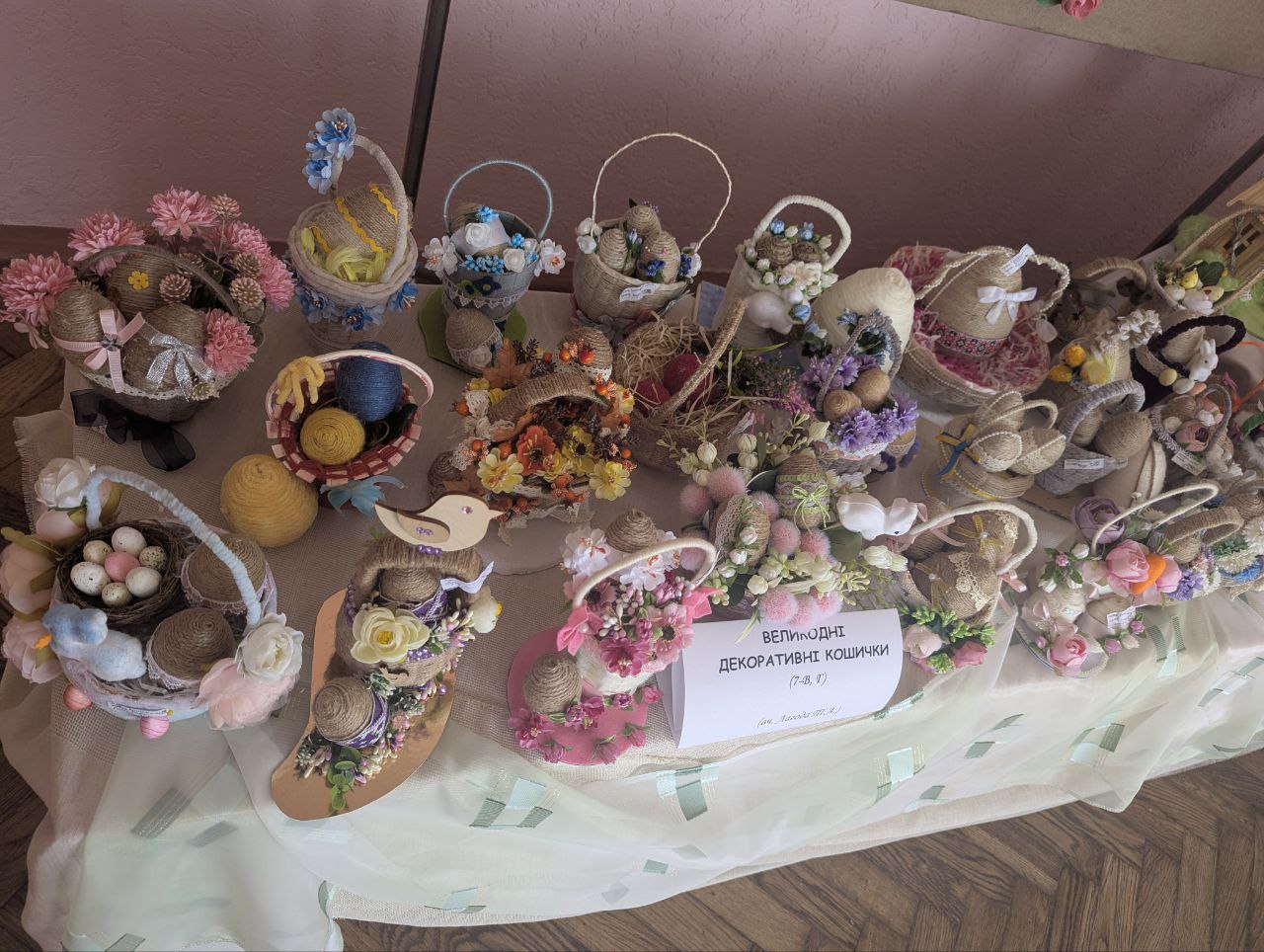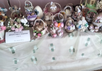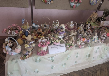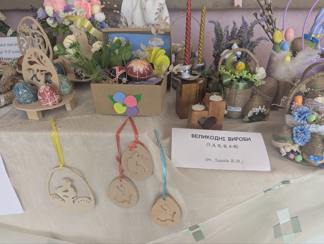 І яких тільки тут витворів не було! Тут і писанки, і мальованки, і святкові корзини з великодніми зайцями та квітами, і пасхальні декоративні віночки, і дизайнерські сувенірні яйця, підсвічники з фанери, деревини та картону, і малюнки та аплікації.