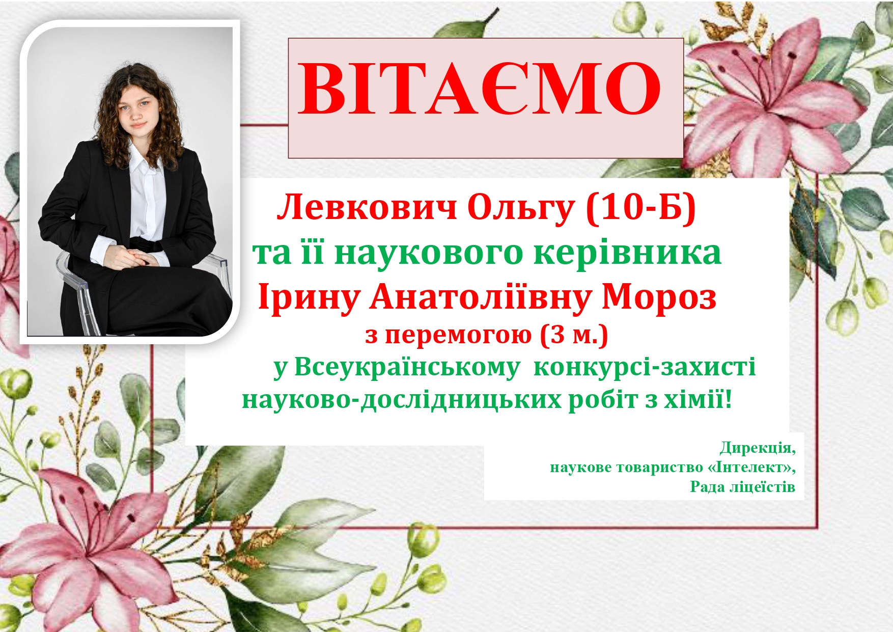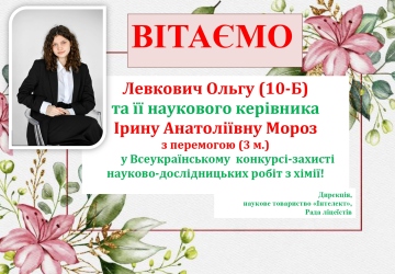 Вітаємо Левкович Ольгу з перемогою у Всеукраїнському конкурсі-захисті науково-дослідницьких робіт