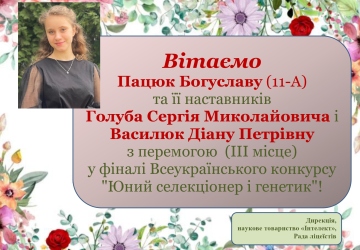 Вітаємо Пацюк Богуславу (11-А) та її наставників Голуба Сергія Миколайовича і Василюк Діану Петрівну з перемогою (ІІІ місце) у фіналі Всеукраїнського конкурсу "Юний селекціонер і генетик"!