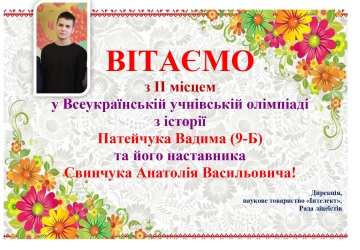 ВІТАЄМО з ІІ місцем у Всеукраїнській учнівській олімпіаді з історії Патейчука Вадима (9-Б) та його наставника Свинчука Анатолія Васильовича!