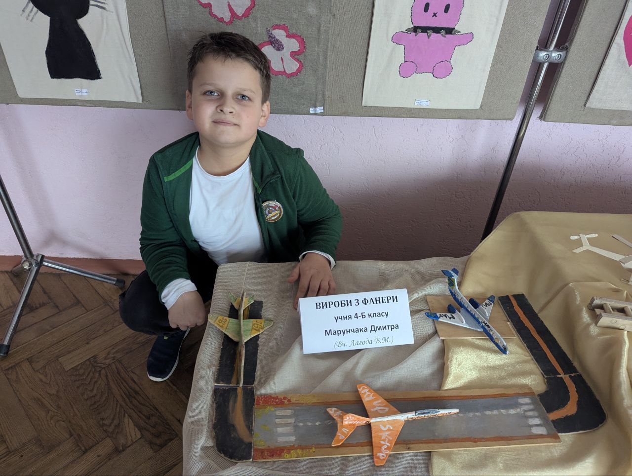 Здобувач освіти 4-Б класу Марунчак Дмитро представив авторську виставку виробів із фанери (макети злітної смуги та літаків), які виготовив на заняттях гуртка "Юні майстри" (керівник гуртка Лагода Володимир Макарович).
